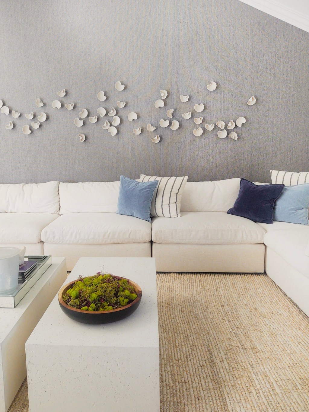 A large wall, odd angles, and a big open space can be difficult to select the right piece of art for. You want to find something that will make a statement and yet still not overwhelm the room. Enter, Gold Leaf Design Group. They have a wonderful assortment of wall decor, or “wall play” that can be custom curated into wild works of three dimensional art. The items are sold to interior designers that are with the trade (I can certainly help you with that) or shop them on Modish or Interior Homes. For this project in Boynton Beach, FL there was about 100 pcs of the ceramic wall play shells that were very decidedly placed over the fourteen foot long sectional sofa from Arhaus. It certainly makes for a fun statement and some coastal vibes.
